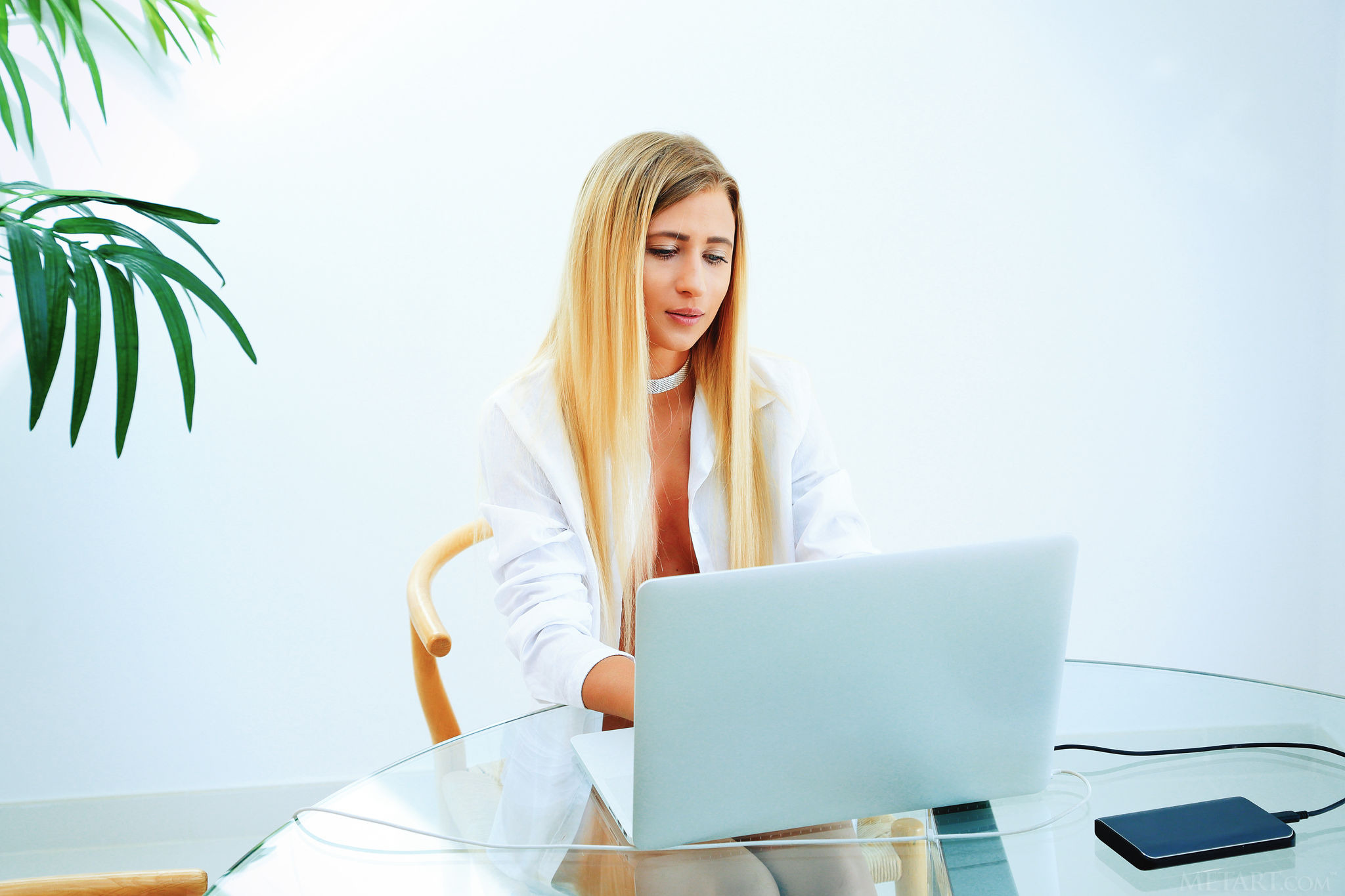Hot blonde Lisa Dawn sits at her laptop 1 / 21